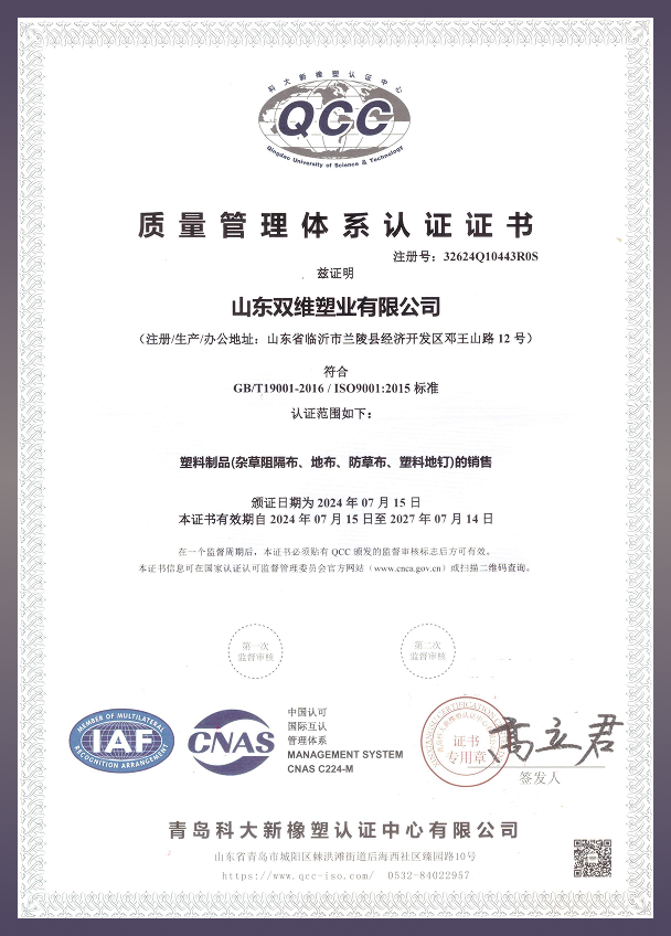 山东双维塑业有限公司,山东省子公司双维智能环境科技有限公司,专业生产防杂草织物、土工布以及育苗织物制作。我们公司已经投资了30多家亿元,现拥有大型高速挤压设备生产线、圆织机、复卷机、包装机、打包机机器和其他先进的生产设备以及完整的包装流水线。目前有8条生产线日产量为80吨。支持产品定制所有尺寸和型号。我公司已通过ISO9001质量管理体系认证,拥有5个注册品牌,NONGFULE,CAOWUYING,CAOJINGLING, DAEZHANG, GAICAOYIFANG.我们公司是致力于“引领发展“实业创世界名牌”坚持生存在质上,在管理上,在技术上,以服务求信誉,以创新求可持续,以创造为客户提供最优质的产品,为客户提供最舒适的服务。